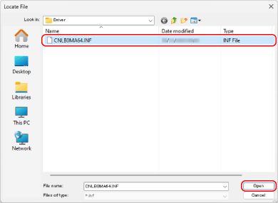 Open the printer driver folder, select the INF file in the [Driver] folder, and click [Open].