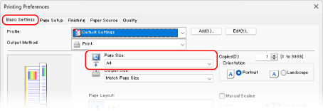 In [Page Size] on the [Basic Settings] tab, select the paper size of the document.