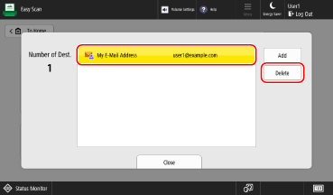 To specify the login user's e-mail address as a destination, press [Send to My E-Mail Address].