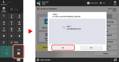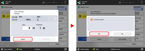 Stop] Is Pressed When There Are Multiple Sending Jobs To cancel another job, press [Check Other Jobs], select the job to cancel from the Send Job list, and press [Cancel].