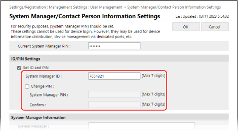To change the PIN, select the [Change PIN] checkbox, and enter the same PIN in [System Manager PIN] and [Confirm].