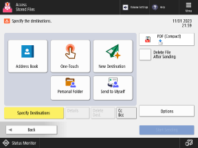 Press [Address Book], [One-Touch], or [New Destination], and specify the destination from the Address Book or enter it directly. Specifying Destinations