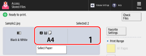 On the file selection screen in a storage space, select a file and press [Print] to display the print settings screen.