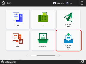 On the control panel, scan a document with the machine from [Scan and Store] in the [Home] screen, and save the scanned data to Mail Box.