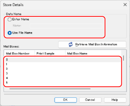 Specify the file name when saved and the Mail Box to be used as the store location.