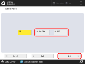 To use Advanced Box as a public storage space in the machine, you must configure the settings to open Advanced Box on the network as an SMB or WebDAV server.