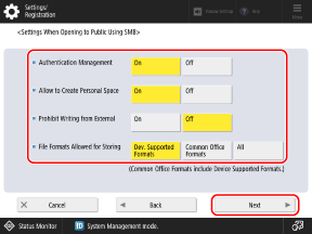 * Even when this is set to [On], an administrator with Administrator privileges can save, create, and delete files and folders while accessing Advanced Box externally (Shared Space only).