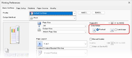 In [Orientation] on the [Basic Settings] tab, check that [Orientation] is set to the same orientation you set in Step