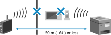 The machine and wireless LAN router should be installed in a location without walls or other obstructions between the devices and within 50 m (164') of each other.