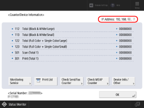 On the control panel, press [] on the [Home] screen or other screen to display the [Counter/Device Information] screen, and check the IPv4 address.