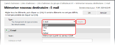 Dans [Type], sélectionnez [Mémoriser à partir du serveur LDAP], puis cliquez sur [Régler].