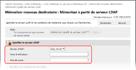 L'écran [Mémoriser nouveau destinataire : Mémoriser à partir du serveur LDAP] s'affiche.