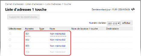 Des numéros à trois chiffres (001 à 200) sont attribués aux boutons 1 touche. En haut de l'écran, sélectionnez une plage de numéros dans [Numéro de liste], puis cliquez sur [Afficher] pour changer les numéros affichés dans la liste.
