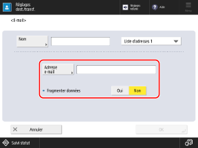 Lorsque vous enregistrez un destinataire de type e-mail dans le carnet d'adresses ou sur un bouton 1 touche, configurez les éléments décrits ci-dessous.