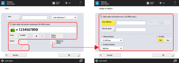 * La machine prend en charge les sous-adresses à la norme de l'UIT-T (Secteur de la normalisation des télécommunications de l'Union internationale des télécommunications). Si la machine destinataire prend en charge la communication par sous-adresse (communication confidentielle), vous pouvez renforcer la confidentialité des documents envoyés en mettant en place une sous-adresse et un mot de passe pour l'envoi.