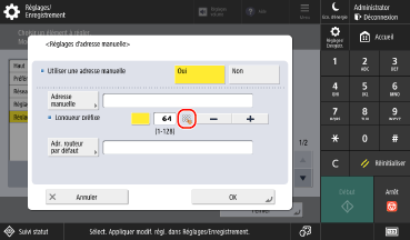 Si le nombre de caractères saisis et la plage de valeur d'entrée sont limités, la valeur et le nombre de caractères que vous pouvez saisir sont affichés entre parenthèses ( ) à côté du nom de l'écran ou du champ de saisie.