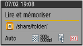 Affiche les réglages suivants : nom de dossier du destinataire, format de l'original, résolution, recto verso et format de fichier.