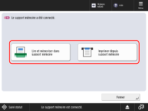 Utilisez le panneau de commande pour éjecter la clé USB de la machine. Vous ne pouvez pas éjecter la clé USB en utilisant l'interface utilisateur distante depuis un ordinateur.