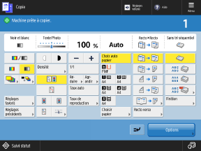 Lorsque vous passez à l'écran de copie rapide, les états de réglage des fonctions de base, telles que l'agrandissement, la réduction et la copie recto verso, sont affichés sous forme de boutons. Comme vous pouvez configurer ces fonctions simplement en appuyant sur les boutons pour les valeurs de réglages affichées, il y a moins d'étapes que lorsque vous utilisez l'écran de copie normale.