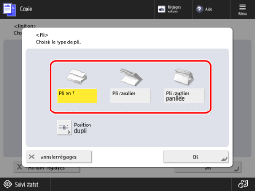 Si vous appuyez sur [Pli cavalier] à l'étape 1, vous pouvez appuyer sur [Position du pli] pour ajuster la position du pli pour chaque format de papier.