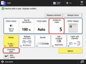 Dans l'écran de copie, saisissez le nombre de copies, puis appuyez sur [Echantillon copie]. Écran de copie