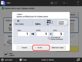 Avant d'appuyer sur [Début de la copie], saisissez à nouveau le nombre de copies à l'aide des touches du pavé numérique.