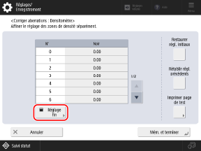 Vérifiez visuellement les échantillons de couleur sur la page de test pour déterminer les valeurs de densité (valeurs d’ajustement) et saisissez une valeur de densité pour chaque numéro.