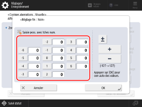 Utilisez le panneau de commande pour effectuer la correction. Vous ne pouvez pas effectuer de réglage à l’aide de l’interface utilisateur distante depuis un ordinateur.