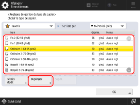 Vous pouvez copier l’un des types de papier déjà enregistré dans la machine, changer le nom du papier et les informations sur le papier et enregistrer le tout en tant que nouveau type de papier (type personnalisé).