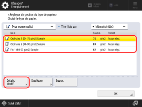 Sélectionnez le papier personnalisé dans la liste et appuyez sur [Détails/Modif.].