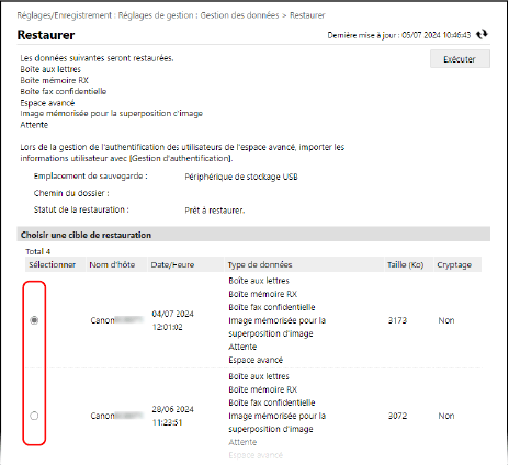 Si les données de l’Espace personnel d’Boîte avancée sont incluses, elles ne seront pas restaurées à moins que les mêmes informations utilisateur que celles de la source de sauvegarde ne soient enregistrées. Dans ce cas, exportez les informations utilisateur de la source de sauvegarde, importez-les sur la machine, puis effectuez la restauration.