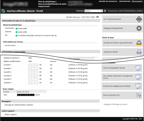 Lorsque vous vous connectez à l’interface utilisateur distante, la page du Portail (page d’accueil de l’interface utilisateur distante) s’affiche. Depuis cette page, vous pouvez vérifier l’état d’utilisation de la machine, afficher diverses informations et changer les paramètres en cliquant sur des boutons.