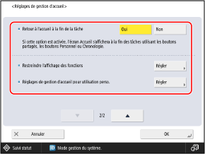 Réglez ce paramètre sur [Oui] pour afficher à nouveau l’écran [Accueil] après une opération effectuée à l’aide d’un bouton partagé, d’un bouton personnel ou de la ligne de temps.