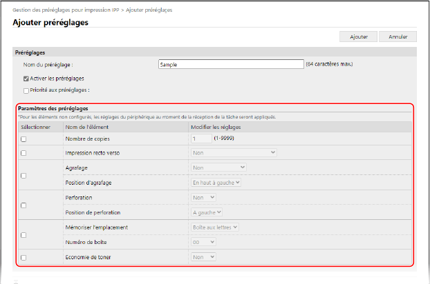 [Gestion des préréglages pour impression IPP].