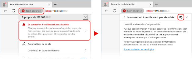 Dans le champ de saisie de l'URL, cliquez sur [Non sécurisé] [La connexion à ce site n'est pas sécurisée] [] (Certificat).
