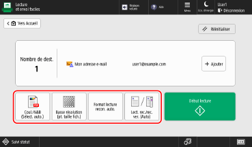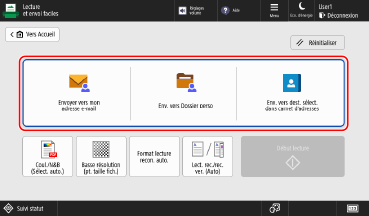 Avec Lecture et envoi faciles/Lecture facile, vous pouvez configurer les fonctions de base, telles que spécifier des destinataires et régler les couleurs, en utilisant simplement des boutons.