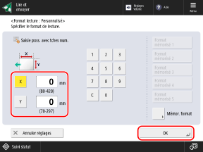 Suivez la procédure ci-dessous pour enregistrer les formats lorsque vous utilisez fréquemment des originaux de format non standard. Vous pouvez appeler le format sur l'écran de saisie du format, ce qui vous évite de saisir le format à chaque fois.
