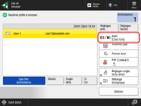 Dans l'écran de numérisation, appuyez sur le bouton de réglage permettant de sélectionner la couleur. Écran de numérisation