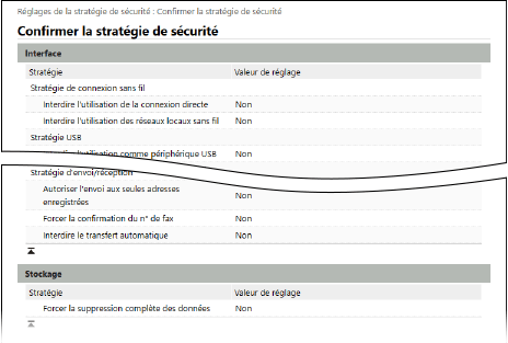 Vous pouvez configurer et vérifier les éléments suivants sur l’écran [Réglages de la stratégie de sécurité] ou [Confirmer la stratégie de sécurité] de l’interface utilisateur distante.
