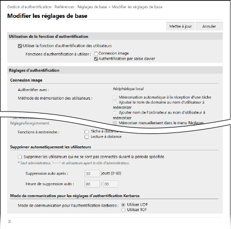 Utilisez cet écran pour activer et désactiver l’authentification de l’utilisateur, spécifiez la méthode de connexion et configurez les paramètres de base de l’authentification de l’utilisateur.