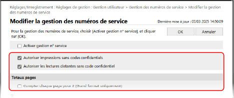 Décochez les cases [Autoriser impressions sans codes confidentiels] et [Autoriser les lectures distantes sans code confidentiel].