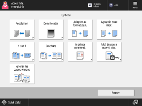 Appuyez sur les boutons dans l'écran pour configurer les réglages d'impression détaillés. Une fois les réglages d'impression configurés, appuyez sur [Fermer] pour revenir à l'écran des réglages d'impression.