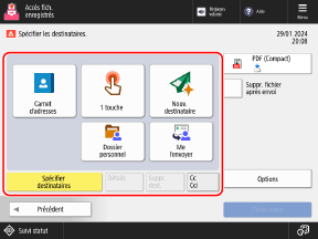 Spécifier des destinatairesPour changer le type (À, Cc ou Cci) du destinataire spécifié, appuyez sur [A/Cci|Cc] ou [A/Cc|Cci], spécifiez le destinataire pour lequel remplacer le type par Cc o Cci, puis appuyez sur [OK].