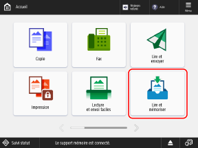 Sur le panneau de commande, numérisez un document avec la machine depuis [Lire et mémoriser] dans l'écran [Accueil], et enregistrez les données numérisées dans la clé USB.