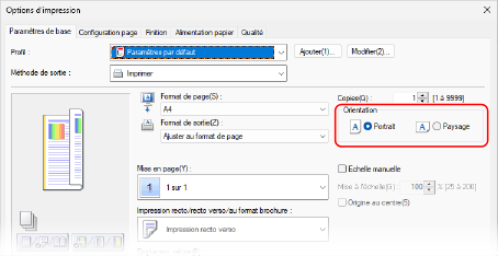 Dans [Orientation] sur l’onglet [Paramètres de base], vérifiez que [Orientation] est configurée sur la même orientation que celle que vous avez configurée à l’étape