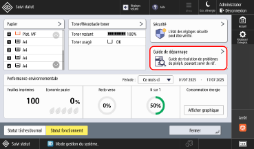 Les informations de support pour le dépannage des problèmes d’impression, de télécopie et d’envoi des données numérisées peuvent être vérifiées dans le [Guide de dépannage] dans l’état de fonctionnement de la machine. Vérification de l’état de fonctionnement de la machine