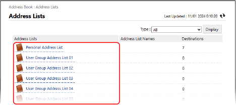 Você pode filtrar os destinos exibidos na lista selecionando o tipo de destino em [Type] ou a inicial do nome em [Initial] no canto superior direito da tela, e depois clicando em [Display].