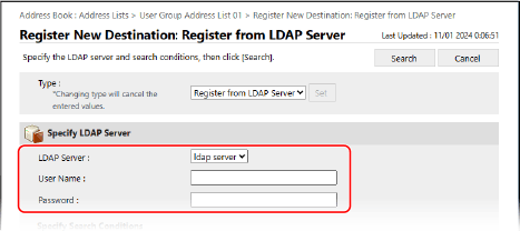 Em [Type], selecione [Register from LDAP Server] e clique em [Set].