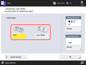 Tela de cópiaA tela [Transparency Cover Sheets] é exibida.