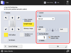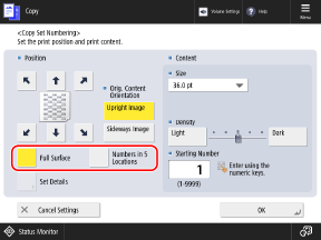 * Você não pode selecionar [Full Surface] e [Numbers in 5 Locations] se as configurações estiverem definidas para adicionar outras informações aos números do conjunto de cópias.